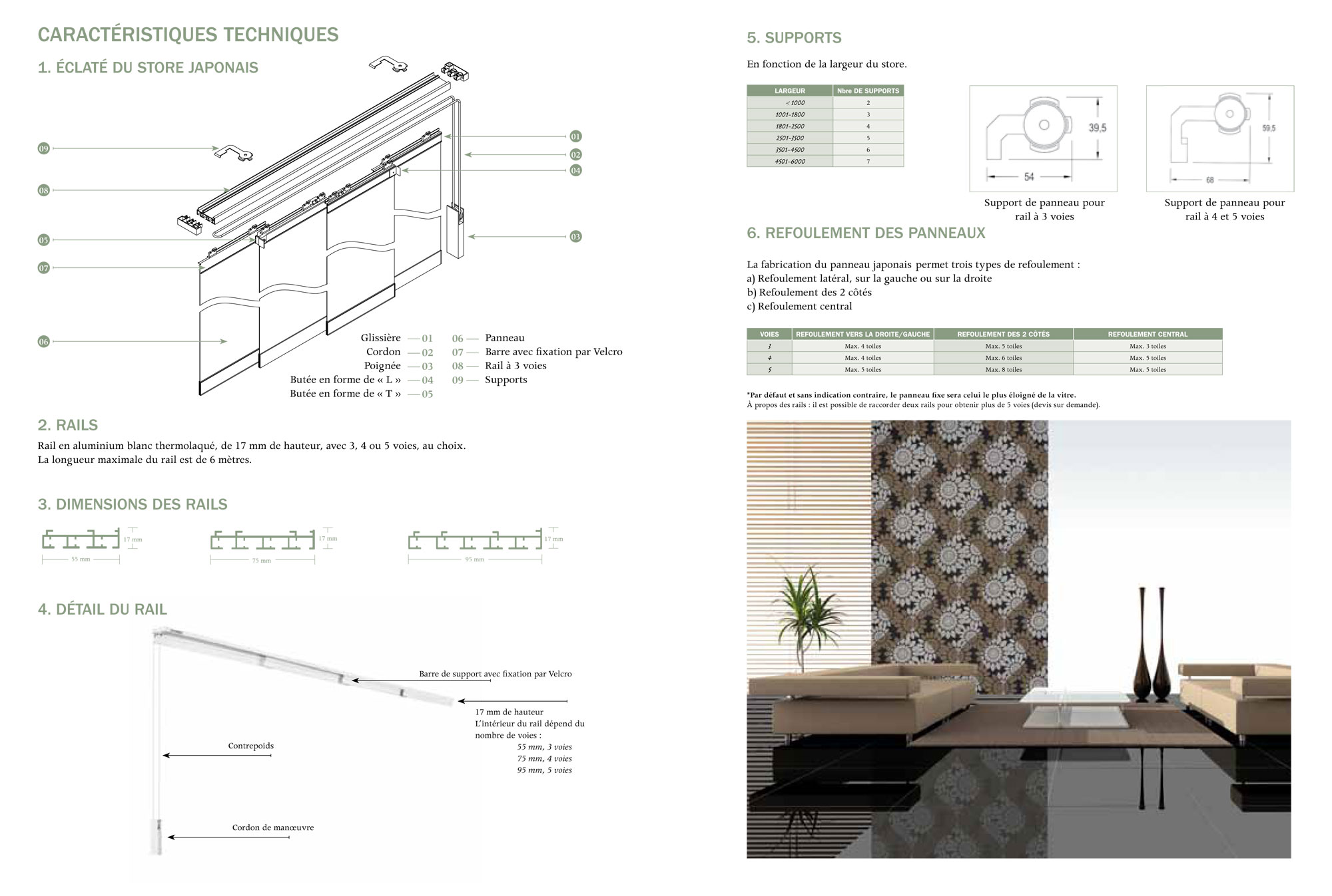 - L’utilisation de panneaux se déplaçant sur des rails permet différentes combinaisons de toiles sur un même store. Le panneaux japonais offre donc de nombreuses options esthétiques.