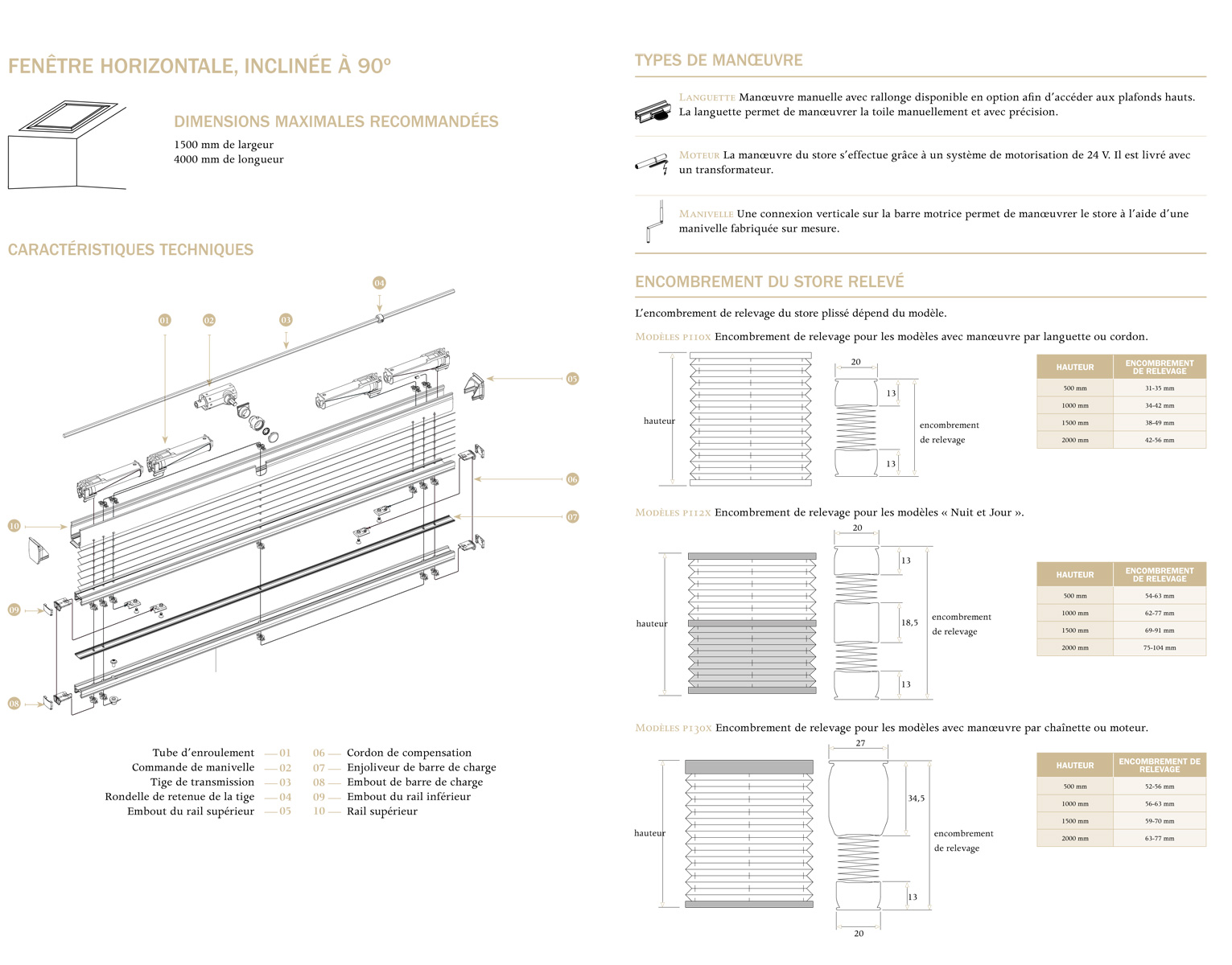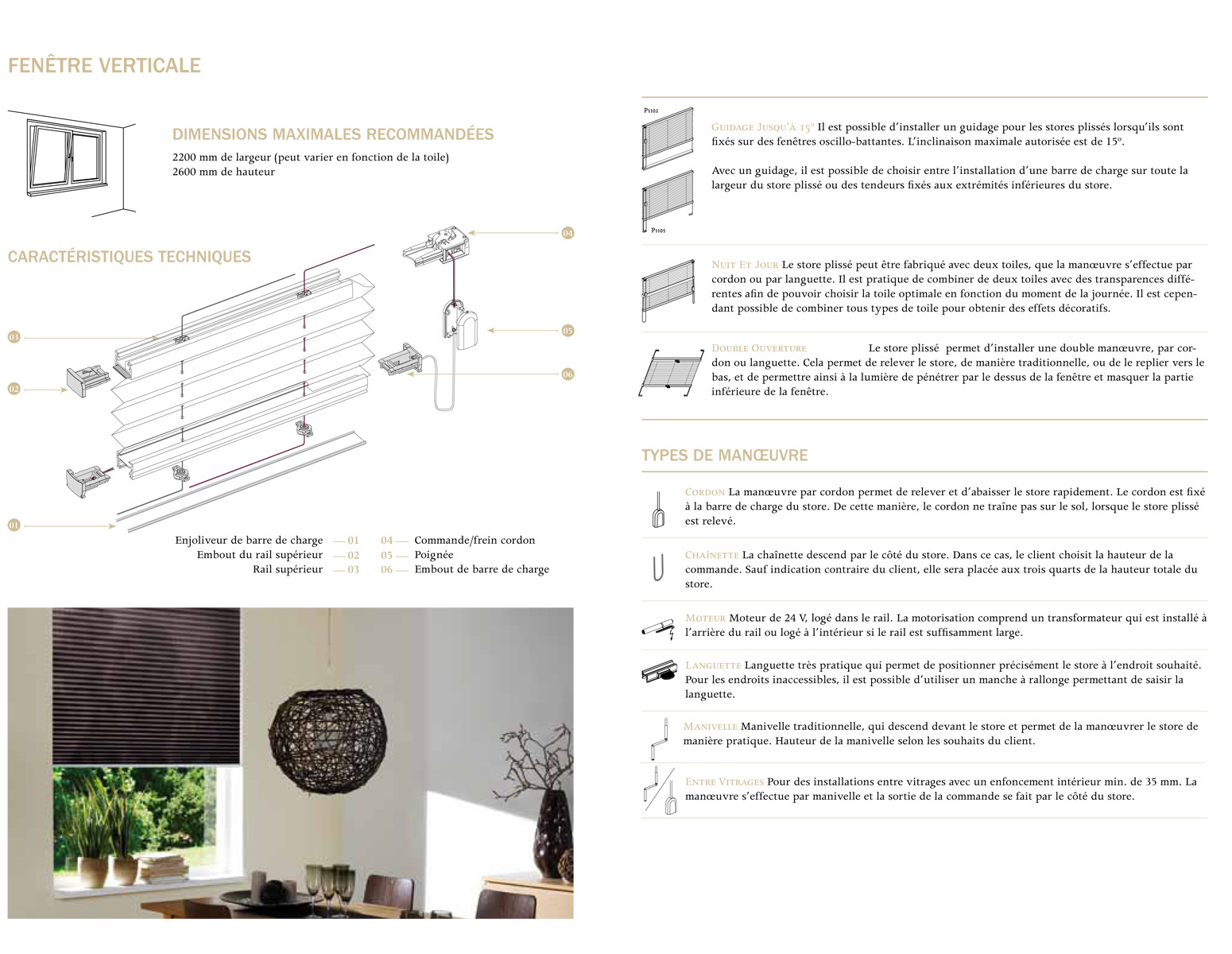 Son concept de fabrication permet de l'utiliser dans des endroits où peu d'espace est disponible pour le relevage. Le store plissé garantit une qualité optimale grâce à l'utilisation de composants de première qualité et des toiles réactualisées.