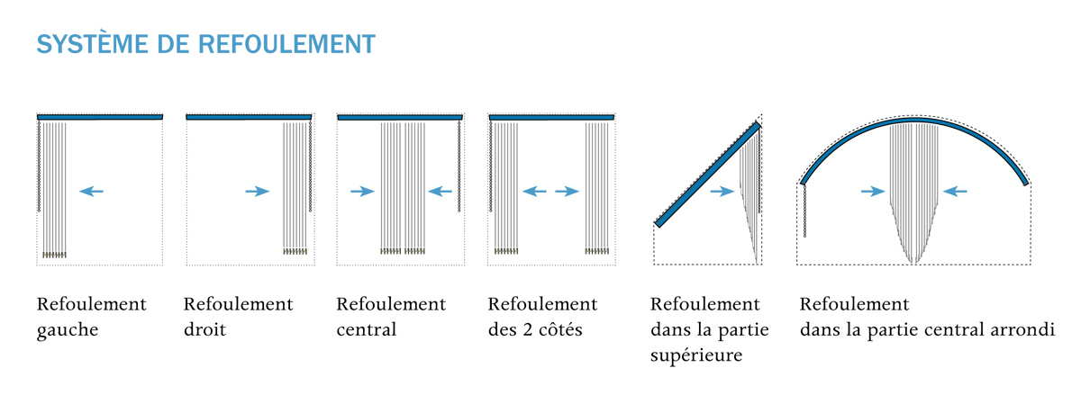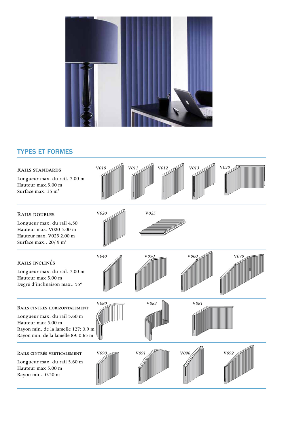Les bandes verticales sont disponibles en plus de 18 formes différentes, classées selon le type de mécanisme et la position des lamelles. Leur conception innovante s'adapte à toutes les formes, qu'il s'agisse de surfaces inclinées, cintrées ou en spirale. Toute leur technologie réside dans les possibilités offertes par le rail. Les lamelles sont fabriquées avec des largeurs standards de 89 mm et 127 mm.