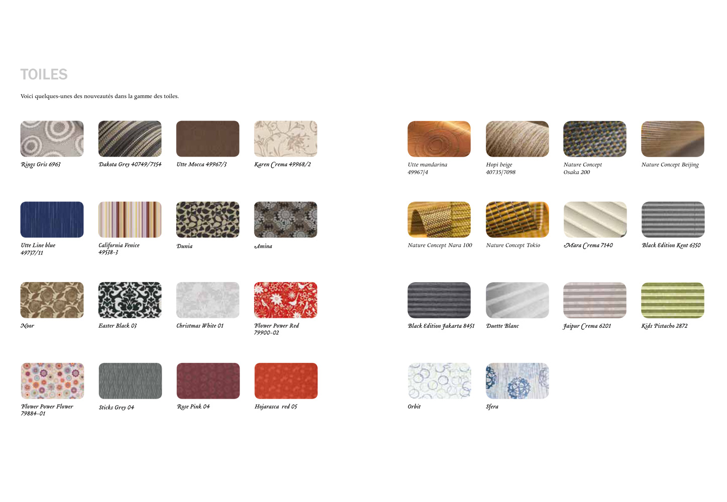 - Disponible dans une gamme étendue de matériaux : tous types de toile, bois, aluminium et PVC.