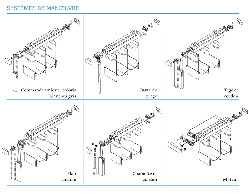 - Les mécanismes de manoeuvre sont nombreux cordon et chaînette, tige et cordon, barre de tirage, cordon à commande unique et moteur.